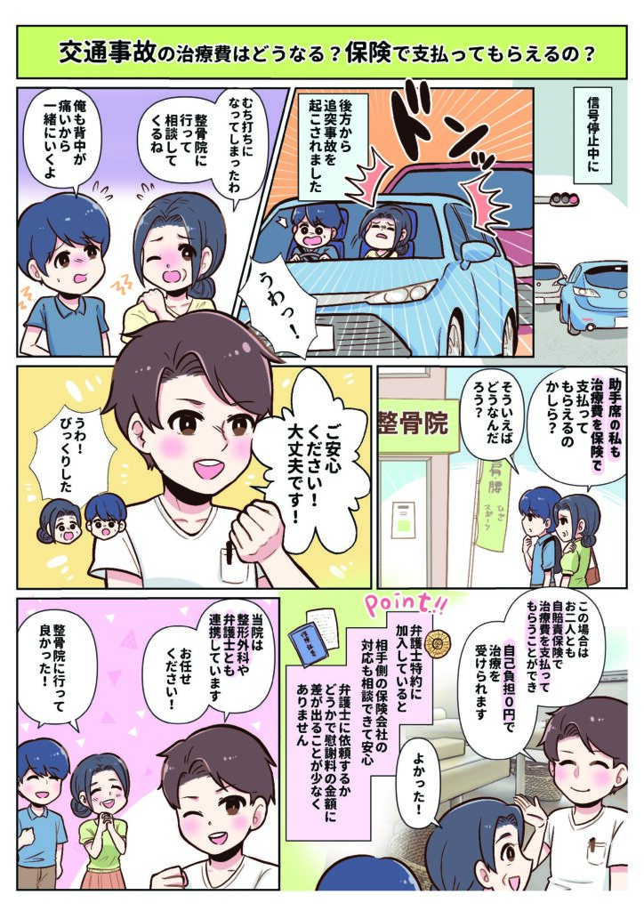 はい、整骨院でも自賠責保険で窓口負担0円で通院できます。医療機関と同様に、保険会社への連絡さえあれば問題ありません。