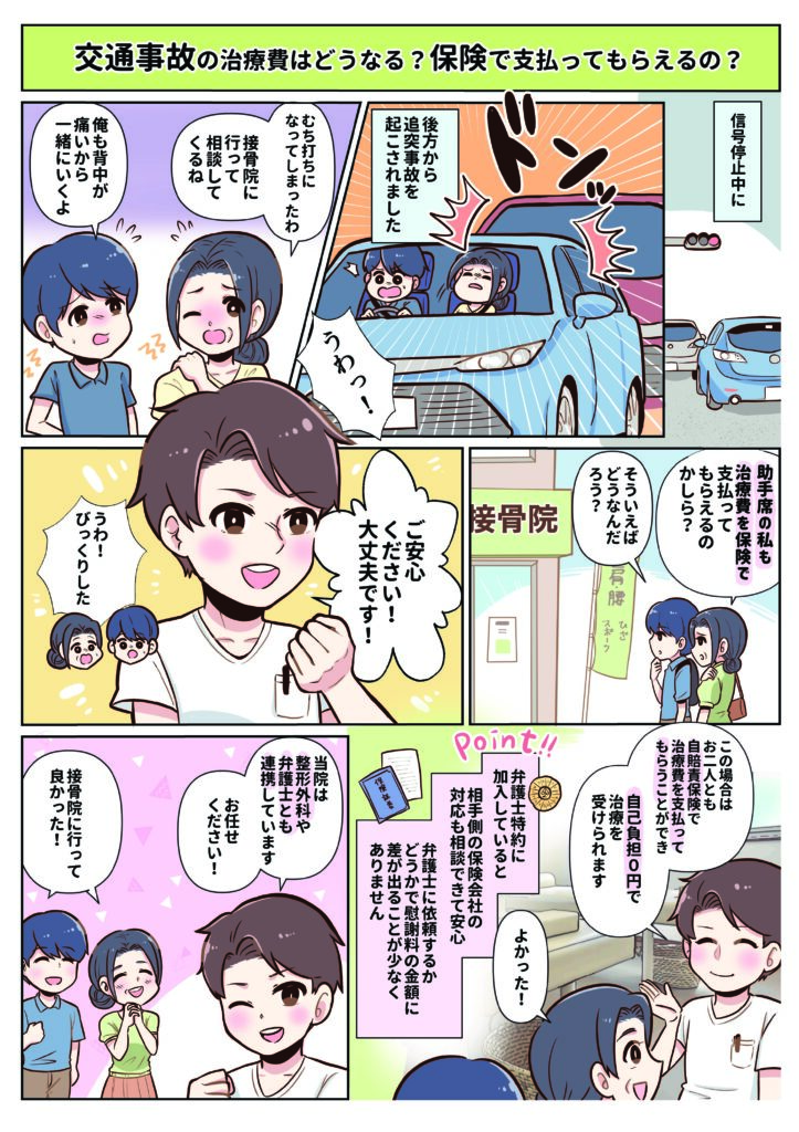 同乗者は被害者として扱われるため、 加害者側の自賠責保険で施術費がまかなわれるケースが一般的です。