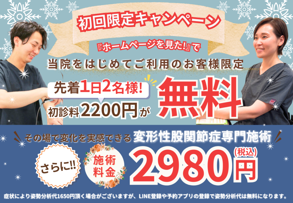 ソリーゾ整骨院・整体院では初めての方でも安心して通えるよう、 ホームページを見た方限定で「初回限定2,980円(税込)」の体験プランをご用意しています。 検査・カウンセリング・施術まですべて含まれていますので、まずはお気軽にお試しください。 詳細な料金や今後のプランについては、初回の際に丁寧にご説明します。
