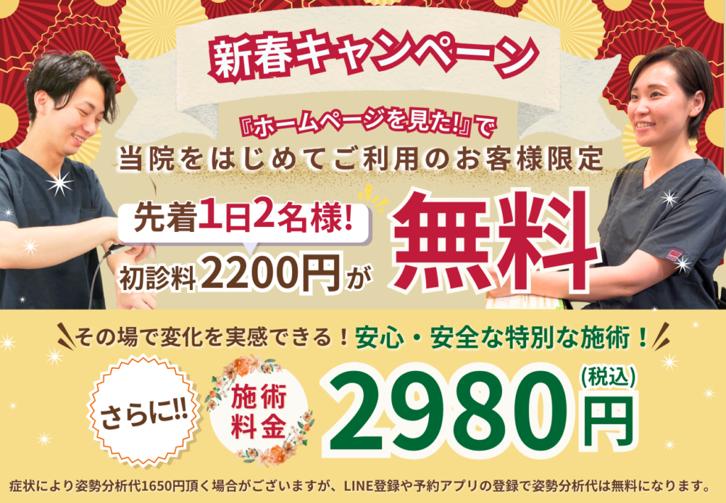 ソリーゾ整骨院・整体院では初めての方でも安心して通えるよう、 ホームページを見た方限定で「初回限定2,980円(税込)」の体験プランをご用意しています。 検査・カウンセリング・施術まですべて含まれていますので、まずはお気軽にお試しください。 詳細な料金や今後のプランについては、初回の際に丁寧にご説明します。