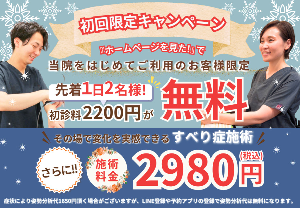 ソリーゾ整骨院・整体院では初めての方でも安心して通えるよう、 ホームページを見た方限定で「初回限定2,980円(税込)」の体験プランをご用意しています。 検査・カウンセリング・施術まですべて含まれていますので、まずはお気軽にお試しください。 詳細な料金や今後のプランについては、初回の際に丁寧にご説明します。