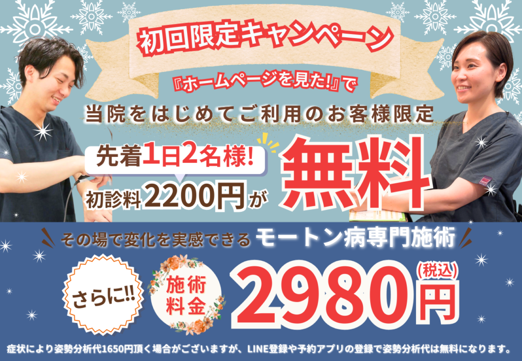 症状の程度や生活習慣によって異なりますが、一般的には週1〜2回の通院を1〜2ヶ月続けることで、痛みが落ち着き始める方が多いです。 初回にしっかりと検査を行い、お一人おひとりに合わせた通院プランをご提案します。