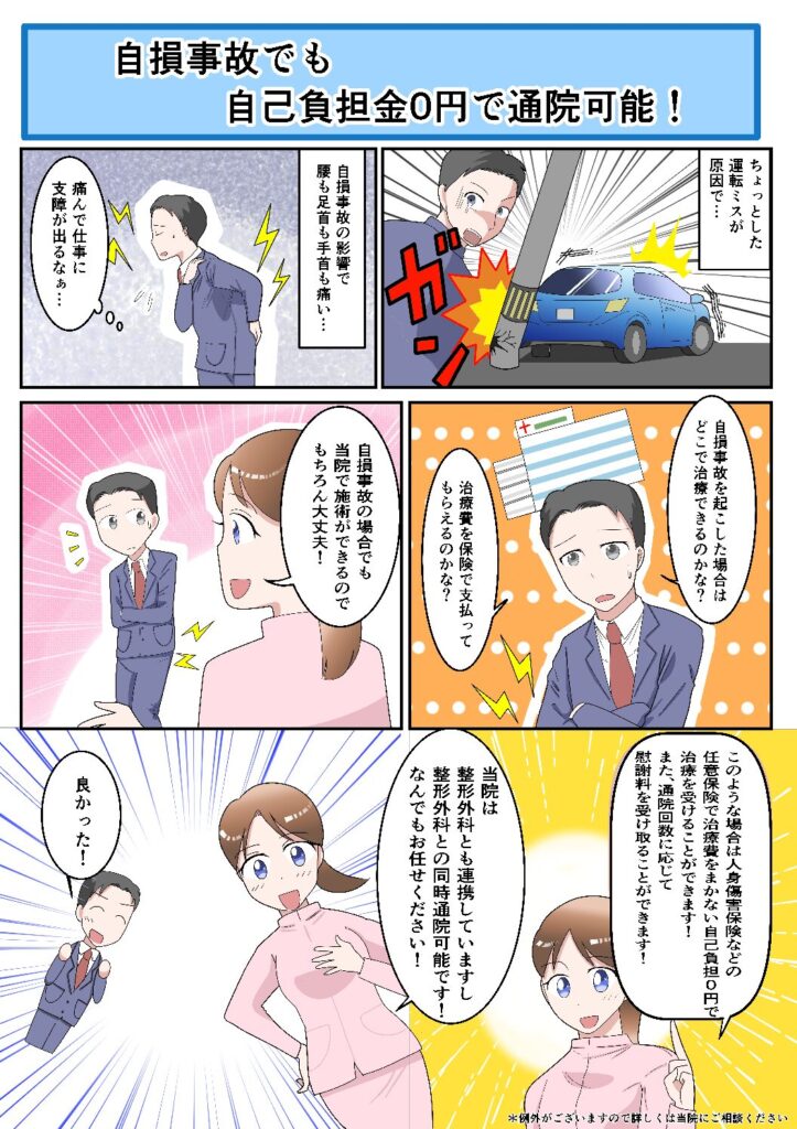 自損事故は誰にでも起こり得るものであり、事故後の対応次第でその後の生活が大きく左右されます。痛みを我慢せず、整骨院で早めに相談・治療を受けることが、回復への第一歩です。