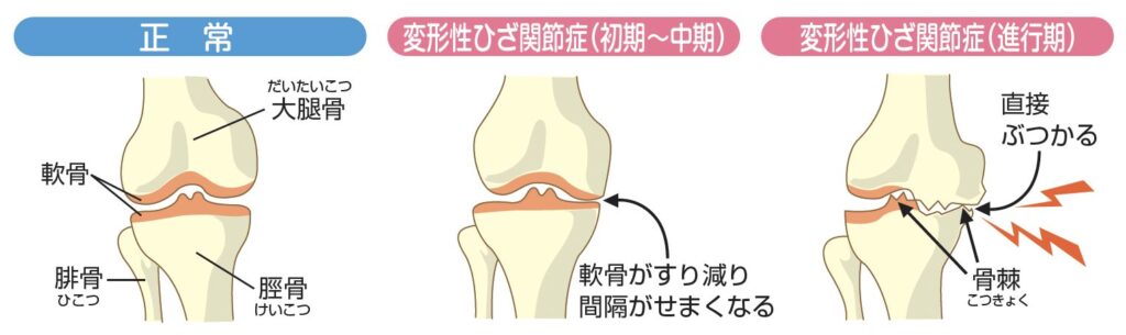 歩いたり、しゃがんだりなどの日常生活動作は膝周辺の筋肉をつかって膝を動かしていますが、年を重ねると徐々に運動量筋力が減りさらに筋肉量も減ってしまいその影響で筋力低下が起き、骨と骨同士の隙間が減りその間にある軟骨(クッション)がすり減ってしまい骨が曲げずらくなったり、伸ばしにくくなったりします。