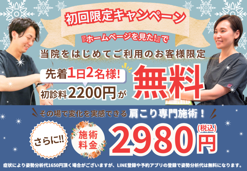 ソリーゾ整骨院・整体院では、ホームページ見た方限定で2,980円で検査・カウンセリング・施術をすべて受けられるプランをご用意しておりますので、まずはお気軽にお試しください。