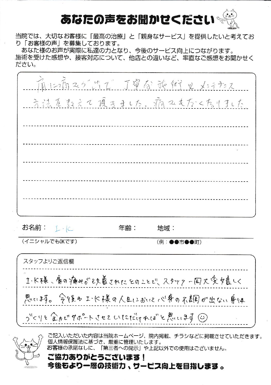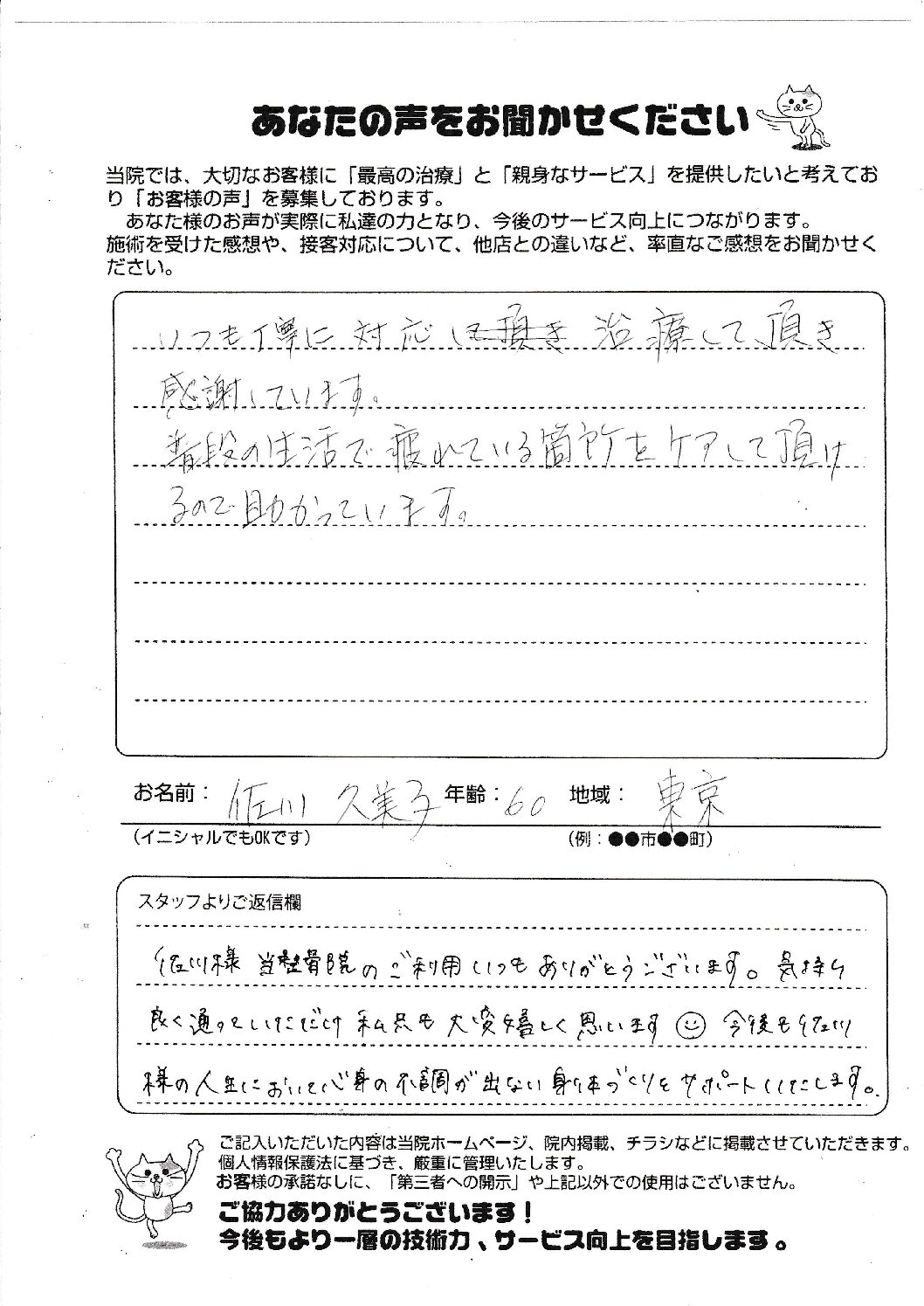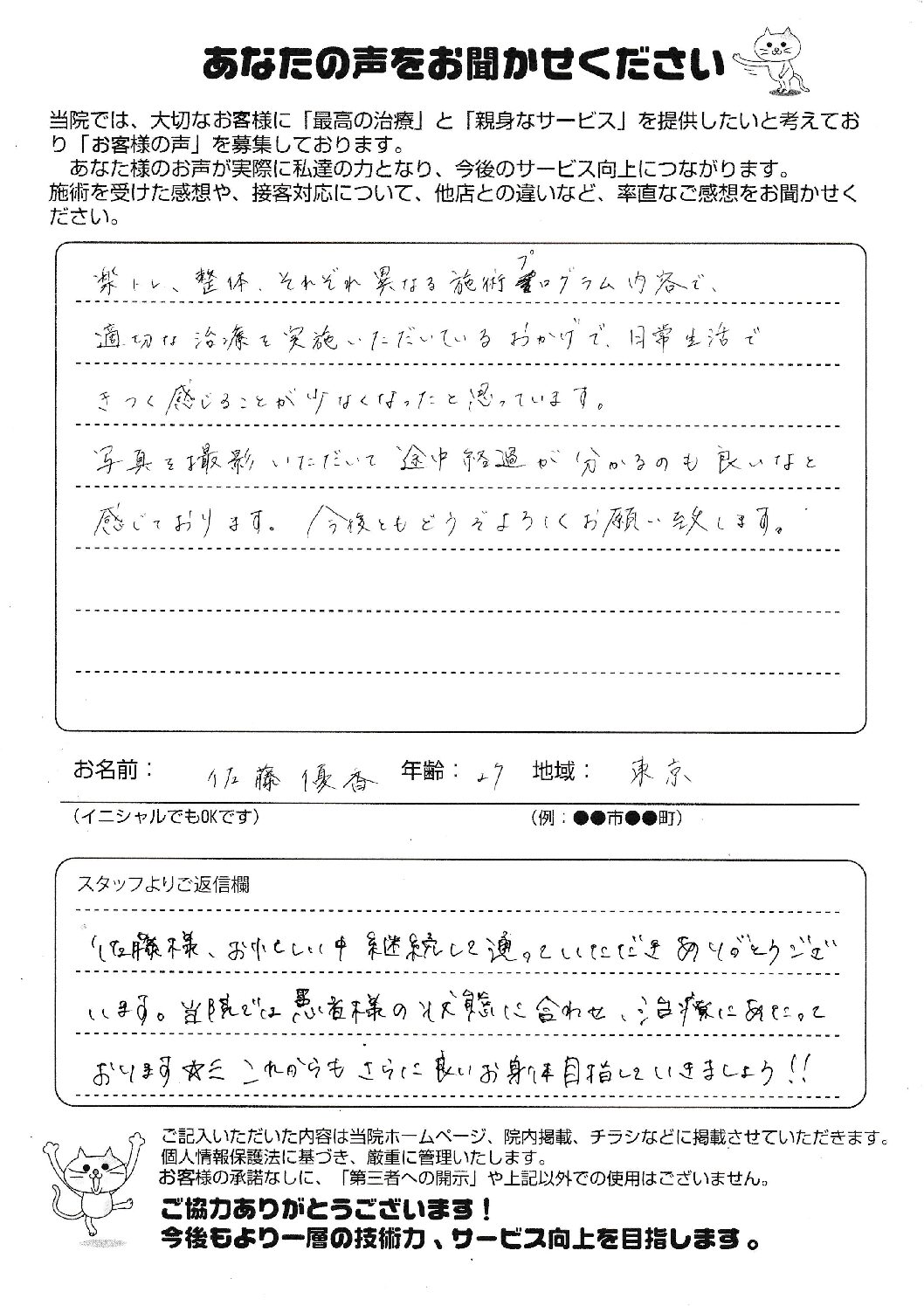 今まで整骨院に通っても、根本が治らず、ただ通い続けている感じでしたが、ソリーゾさんは、通う度に体が軽くなり日々の姿勢も、気を付けなければ!!と、自分から姿勢をなおすようになりました。そして骨盤が正しい位置になったことで腰まわりがやせました!!キープしています。骨盤の正しい位置になると内臓も定位置に戻って、身体の調子がいいです!!そして、素敵なスタッフさんがたくさん!!安心して通えます。これからもよろしくお願いします。