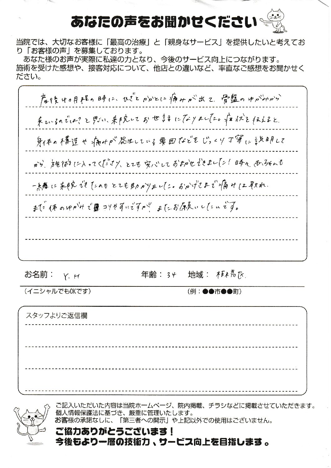 スッキリしない毎日を送られていたとのことで、大変お辛かったですよね。ひざの痛みの改善を実感いただけ、足の運びが楽になられたこと、私共も嬉しく思います。
