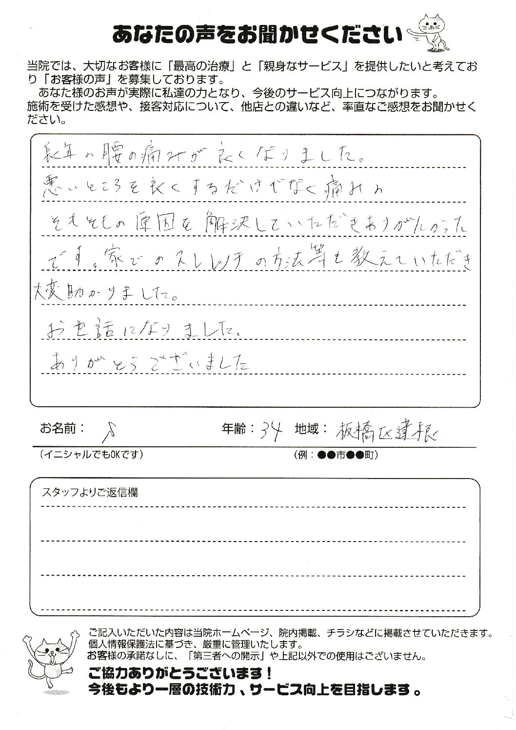 長年の腰の痛みが良くなりました。 悪いところを良くするだけではなく痛みのそもそもの原因を解決していただきありがったかったです。 家でのストレッチの方法等を教えていただき大変助かりました。 お世話になりました。 ありがとうございました。